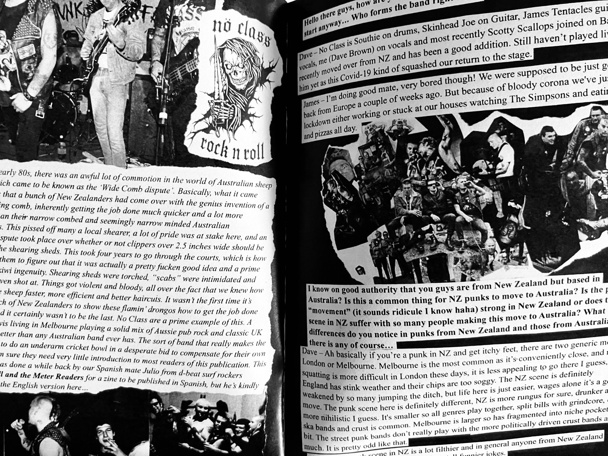 It's a stacked zine sharing most of it's content between NZ and OZ bands but not only: interviews with Kennel Grind, No Class, Liquid Nails (great stories of the early punk scene in Tasmania!) and even one with Henry Rollins talking about some of his experiences in Australia and doing commercials for Scion. There's also an Hellenic Punk Travel article which is sick, documenting Sam stay in Greece and his experience of the punk scene over there, a deep dive on OZ's Northern Territories bands, an article about Wellington punk pionneers Riot 111 and more stuff. The layout is strictly cut'n'paste and proper gritty, it's well written, honestly if you're the curious type and you're not afraid of things you don't already know or just just wanna know what punk is like in on the other side of the world, then this one is worth picking up.