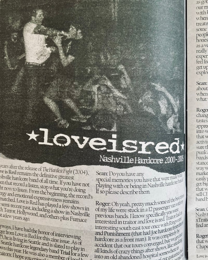 Newer zine out of Nashville, and with this issue Sean focus strictly on the "Athens Of The South's" own local hardcore history, from the earliest Nashville HC band to ever exist (Commitee For Public Safety) to Love Is Red or From Ashes Rise to the newer generation of bands like Caught Lackin' and Take The Shot.