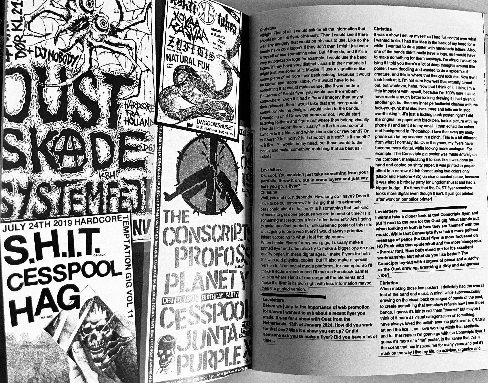 Going through a selection of flyers from Christina’s collection, the conversation touches on a wide range of topics where punk ethics, politics, graphic design and booking/playing/attending live shows collide, doubling up at the same time as a insight into the Copenhagen scene, with plenty of stories about the old and new Ungdomshuset.