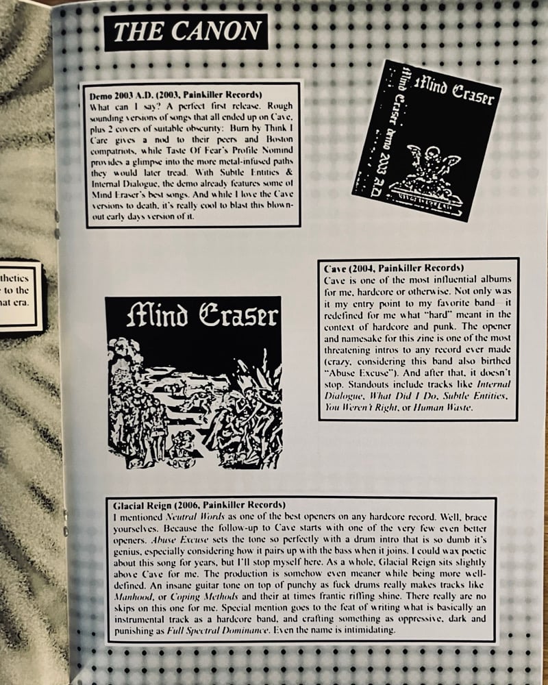 Anyone reading this and going "who??" should either get a copy of this zine and track a copy of Glacial Reign at the same time, or start reconsidering if hardcore is the thing to do for them. If you're already familiar with their discography, then this should just consolidate your appreciation for one of the most extreme and uncompromising bands out of the 2000s Boston/Mass scene. Crazy to think back then that some of the same players beind Mental or Righteous Jams could muster something so bleak and violent. I'm gonna stop disgressing here, you get the point, and you should get this zine.